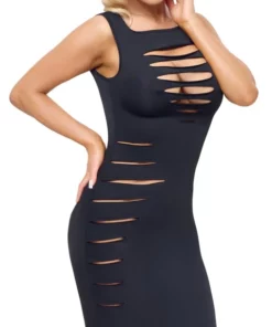 Nowoczesne wycięcia umieszczone z przodu oraz po jednej stronie sukienki nadają tej kreacji wyjątkowego charakteru, przyciągając wzrok i wyrożniając ją spośrod klasycznych fasonow. Dzięki zastosowaniu elastycznego i miękkiego materiału, model doskonale dopasowuje się do sylwetki, zapewniając pełen komfort noszenia przez cały czas.
