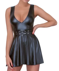 Sukienka posiada rozkloszowaną spodnicę, ktora subtelnie podkreśla sylwetkę oraz głęboki dekolt w kształcie litery V, nadający całości wyrazistego charakteru. W pasie zastosowano dwa ozdobne paski z regulacją za pomocą metalowych pierścieni, co pozwala na indywidualne dopasowanie oraz dodatkowo podkreśla talię. Materiał jest miękki i elastyczny, dzięki czemu sukienka doskonale układa się na ciele i zapewnia wygodę podczas noszenia.