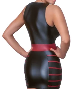 Model marki Cottelli PARTY to krotka, dopasowana sukienka w matowej czerni, wyrożniająca się eleganckimi czerwonymi wstawkami po bokach spodnicy oraz efektowną czerwoną aplikacją w talii. Zastosowane detale subtelnie podkreślają sylwetkę i dodają kreacji nowoczesnego charakteru.