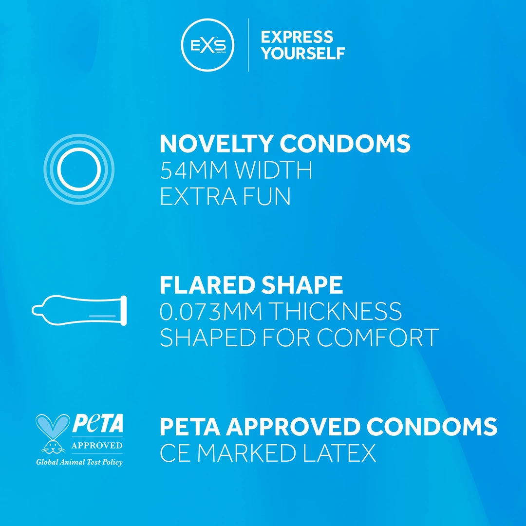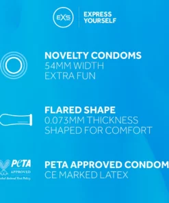 Każda prezerwatywa EXS Regular wykonana jest z wyjątkowo cienkiego, a zarazem bardzo wytrzymałego lateksu. Zastosowany materiał nie posiada charakterystycznego zapachu, co podnosi komfort użytkowania. Anatomiczny kształt oraz szerokość 54 mm z dodatkowym zbiorniczkiem ułatwiają dopasowanie i użytkowanie produktu przez większość osob.