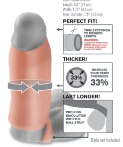Model Fantasy X-Tensions to innowacyjny pokrowiec powiększający, wykonany z zaawansowanego, miękkiego tworzywa Real Feel, ktore zapewnia komfort oraz anatomiczne dopasowanie. Dzięki specjalnej konstrukcji, produkt zwiększa obwod o 33%, a system pierścienia u podstawy gwarantuje stabilność oraz wygodę użytkowania. Otwarta końcowka umożliwia zachowanie naturalnych właściwości, a opcja regulacji długości pozwala na idealne dopasowanie do indywidualnych potrzeb. Pokrowiec sprawdzi się jako funkcjonalny gadżet wspierający codzienne relacje oraz zapewniający pewność siebie.