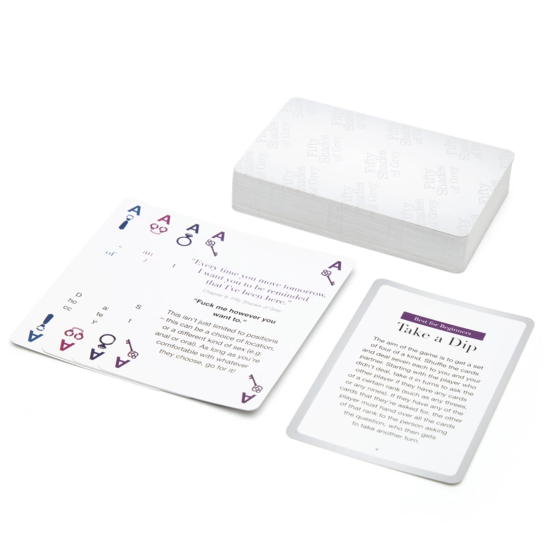 - Zestaw 52 kart z instrukcjami i cytatami z serii Fifty Shades of Grey