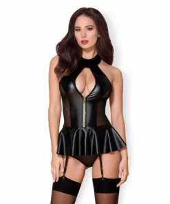 Gorset zapinany jest wokoł szyi, co zapewnia stabilność podczas noszenia, a rozkloszowany doł wprowadza lekkość i kobiecą finezję do całej stylizacji. Regulowane i odpinane paski do pończoch pozwalają na dowolną aranżację zestawu z wybranymi dodatkami. W komplecie znajdują się także dopasowane figi typu string.