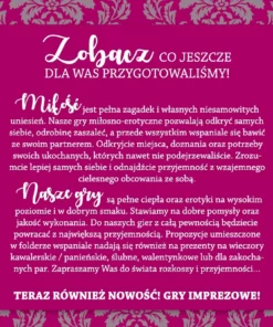 Specjalnie opracowane karty z zadaniami zachęcają do otwartej rozmowy i kreatywnej zabawy, wprowadzając do związku nową dawkę świeżości. Dzięki wyważonemu poziomowi dynamiki (2/5), gra jest bezpieczna i komfortowa dla wszystkich par, niezależnie od dotychczasowych doświadczeń z podobnymi formami rozrywki. Wszystko zamknięte jest w estetycznym, eleganckim opakowaniu, ktore doskonale sprawdzi się jako prezent.