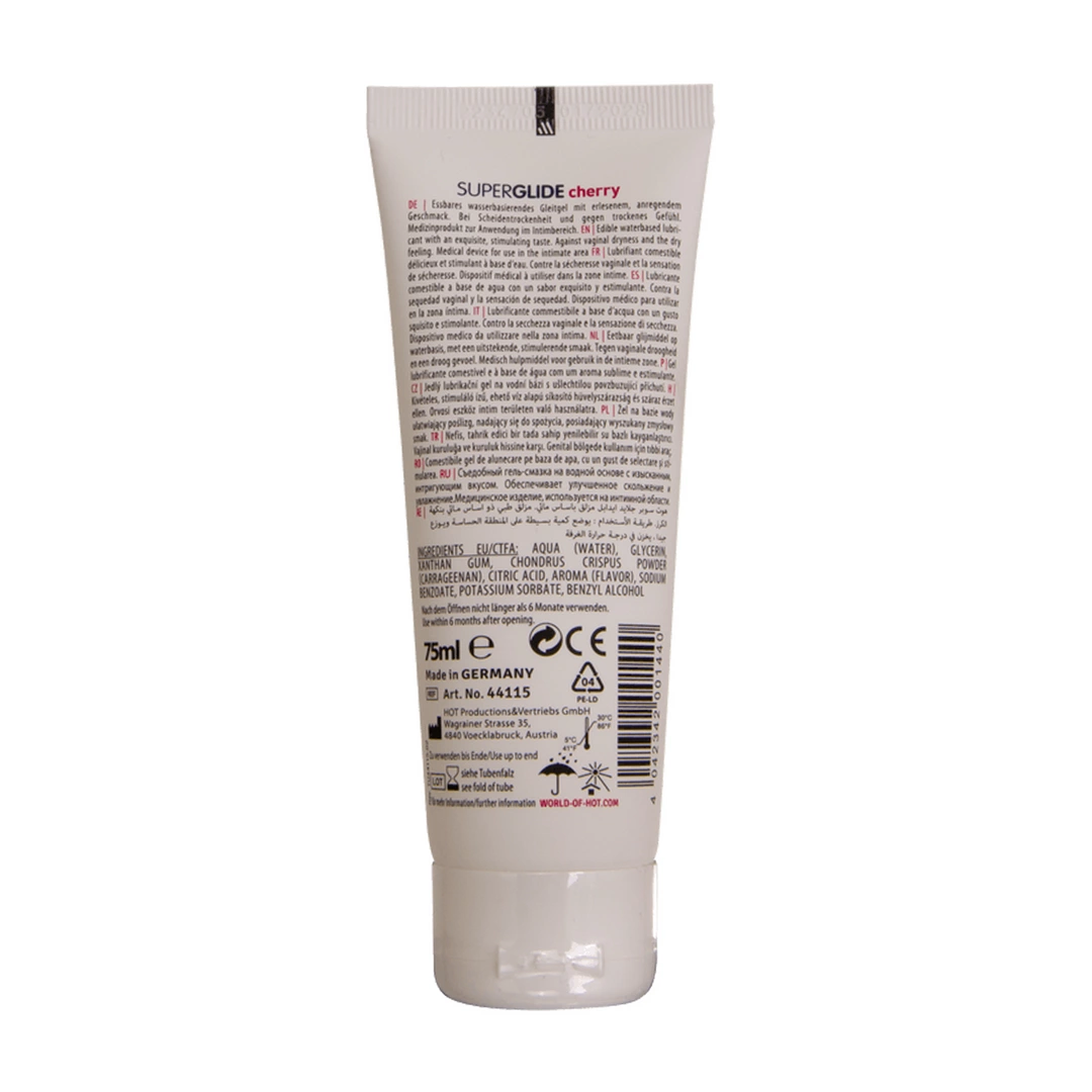 HOT Superglide Water-Based Żel nawilżający jadalny 75 ml to innowacyjny produkt stworzony z myślą o osobach poszukujących wysokiej jakości środkow intymnych o wszechstronnym zastosowaniu. Ten żel nawilżający na bazie wody wyrożnia się możliwością spożycia, dzięki czemu nadaje się do urozmaicenia każdego spotkania we dwoje. Produkt jest w 100% jadalny i dostępny w kilku wykwintnych smakach, co potwierdza jego uniwersalność i wygodę użytkowania. Składniki żelu zostały dobrane tak, aby były bezpieczne dla skory oraz śluzowek, a jednocześnie spełniały normy spożywcze. Przezroczysta, gładka konsystencja gwarantuje doskonałe właściwości nawilżające i łatwe zmywanie z powierzchni skory oraz tkanin. Butelka o pojemności 75 ml posiada wygodne zamknięcie, ktore ułatwia precyzyjne dozowanie produktu.