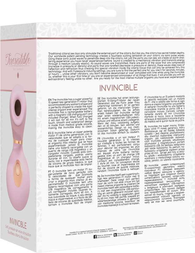 Shots Irresistible Invincible to nowoczesny model pulsującego urządzenia do stymulacji, zaprojektowany z myślą o wysokim komforcie oraz bezpieczeństwie użytkowania. Wyposażony w silnik nowej generacji F1 z 10 precyzyjnymi trybami pracy, zapewnia szeroki zakres personalizacji intensywności działania. Ergonomiczna forma została opracowana tak, aby doskonale dopasowywała się do anatomicznej budowy, gwarantując skuteczne działanie niezależnie od preferencji.