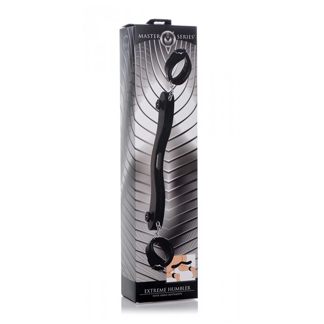 XR Brands Humbler z kajdankami na kostki – profesjonalny system kontroli ruchu z solidnym, drewnianym wspornikiem