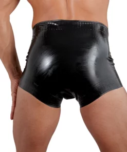 Produkt wykonany w całości z naturalnego lateksu o grubości 0,4 mm, co podkreśla nowoczesny charakter oraz odporność na rozciąganie. Bokserki utrzymane są w eleganckim czarnym kolorze, ktory doskonale wpisuje się w modny, minimalistyczny design. Model ten przeznaczony jest dla osob poszukujących oryginalnych rozwiązań oraz odzieży o specjalnym charakterze.