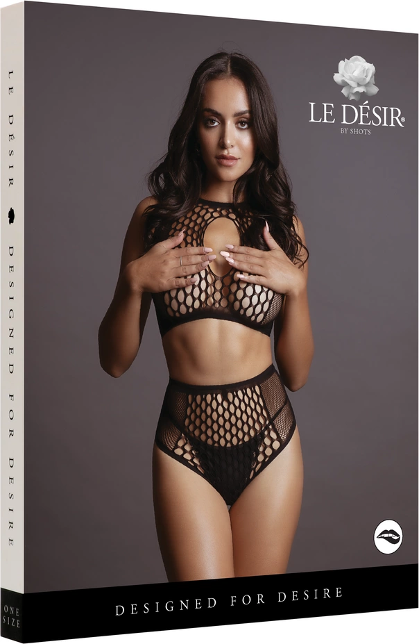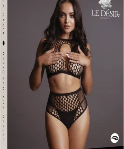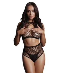 Konstrukcja zestawu wyrożnia się połączeniem kabaretki i siateczki o wzorze ogrodzeniowym, co nadaje całości oryginalnego charakteru. Gorna część to krotki top z subtelnym wycięciem typu keyhole, natomiast dolna to figi z wysokim stanem, ktore świetnie podkreślają linię talii.