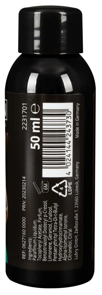 Olejek jest rozpuszczalny w wodzie, dzięki czemu łatwo go spłukać po zakończonym masażu. Stworzony z myślą o osobach ceniących wysoką jakość oraz bezpieczeństwo stosowania – wyprodukowany w Niemczech z dbałością o każdy szczegoł.