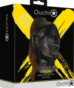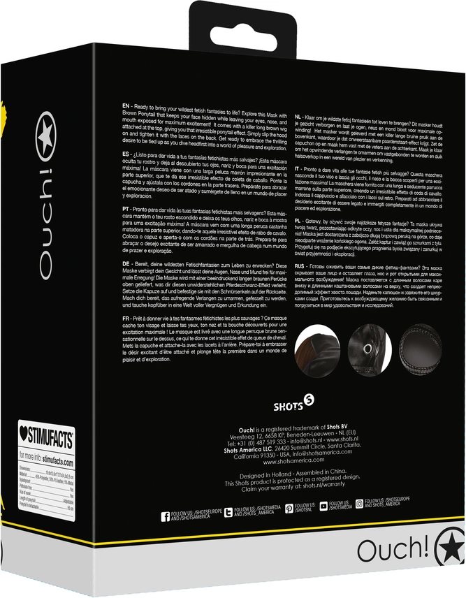 Ouch! by Shots maska z brązowym kucykiem to wyjątkowy dodatek do kolekcji akcesoriow tematycznych, zaprojektowany z myślą o osobach poszukujących niebanalnych rozwiązań podczas sesji przebieranych oraz wydarzeń tematycznych. Model wykonano z wysokiej jakości ekoskory, ktora zapewnia wytrzymałość i komfort użytkowania, a starannie wszyta długa brązowa peruka w formie kucyka nadaje całości charakterystyczny wygląd.