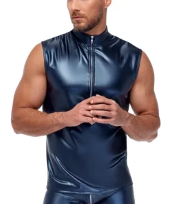 Nowoczesny styl i wyjątkowy charakter – koszulka męska NEK bez rękawow w kolorze metalicznego, matowego niebieskiego to idealne połączenie komfortu i oryginalności. Model wyrożnia się błyszczącą, metaliczną powierzchnią o matowym wykończeniu, ktora przyciąga uwagę i podkreśla sylwetkę.
