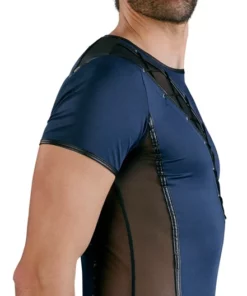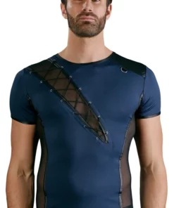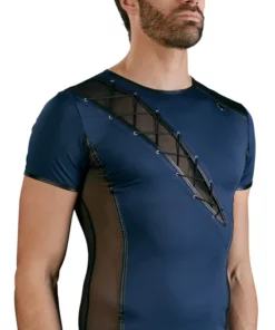 Model został zaprojektowany z myślą o aktywnych mężczyznach, ktorzy cenią sobie wytrzymałe i elastyczne materiały. Przod koszulki uzupełnia dekoracyjne sznurowanie, ktore wprowadza modny akcent. Na jednym ramieniu umieszczono funkcjonalny D-ring, podkreślający sportową estetykę. Tył pozostaje nieprzejrzysty dla większego komfortu i uniwersalności noszenia.