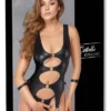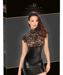 Wyjątkowy model marki Noir Handmade – krotka sukienka mini w kolorze głębokiej czerni, ktora łączy nowoczesny design z wysoką jakością wykonania. Gorna część sukienki wykonana została z subtelnej, misternie zdobionej koronki, podczas gdy dolna część to matowy, lekko błyszczący materiał typu powerwetlook. Ta kombinacja gwarantuje efektowny i elegancki wygląd, idealny na wyjątkowe wieczory.