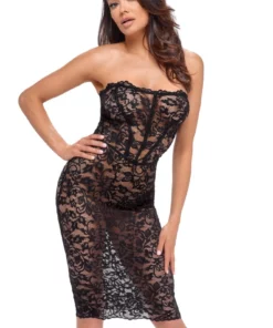 Sukienka sięga do kolan i posiada oryginalny fason bez ramion, ktory podkreśla linię ramion i szyi. Przod zdobią stylowe szwy modelujące, a tył wyposażono w efektowne sznurowanie na całej długości aż do linii bioder – sznurowanie można regulować według własnych potrzeb, co pozwala na idealne dopasowanie do figury.