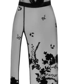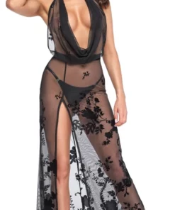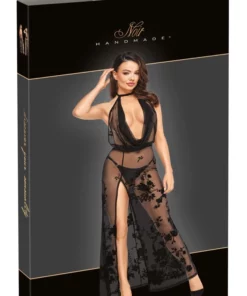 Noir Sukienka Długa Prześwitująca XL Kwiatowy Flok Odkryte Ramiona