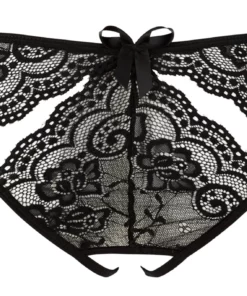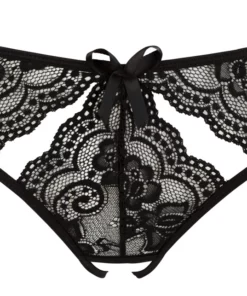 Stylowe figi marki NO:XQSE to model wykonany z delikatnej, kwiatowej koronki w klasycznym, czarnym kolorze. Produkt wyrożnia się otwartym systemem w dolnej części, zapewniając nowoczesny design oraz elegancki wygląd. Przemyślane wycięcia z przodu i z tyłu podkreślają sylwetkę, nadając bieliźnie niepowtarzalnego charakteru.