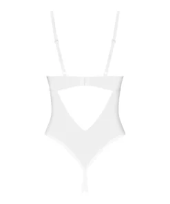Ekskluzywny model marki Obsessive – body Alissium w śnieżnobiałym kolorze to propozycja dla osob ceniących subtelność oraz eleganckie wykończenia. Minimalistyczna stylistyka wzbogacona o starannie dobrane detale podkreśla anatomiczne linie sylwetki, zapewniając komfort oraz wyjątkowy wygląd w każdej sytuacji. Głęboki dekolt oraz miękkie miseczki z fiszbinami dbają o optymalne podtrzymanie, a transparentny materiał z geometrycznym wzorem koronki nadaje całości unikalny charakter. Rożowozłota zawieszka stanowi gustowne wykończenie projektu.
