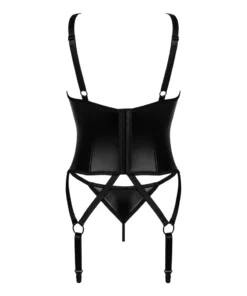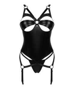 Koszulka wykonana została z elastycznego materiału z połyskującą powłoką poliuretanową, ktory subtelnie podkreśla sylwetkę. Usztywnione miseczki z fiszbinami posiadają stylowe wycięcia oraz delikatny element biżuteryjny, nadając całości elegancki charakter. Ramiączka oraz paski do pończoch ozdobione pierścieniami są regulowane, pozwalając na indywidualne dopasowanie do sylwetki. Zapięcie na haftki umieszczone z tyłu dodatkowo zwiększa wygodę użytkowania.