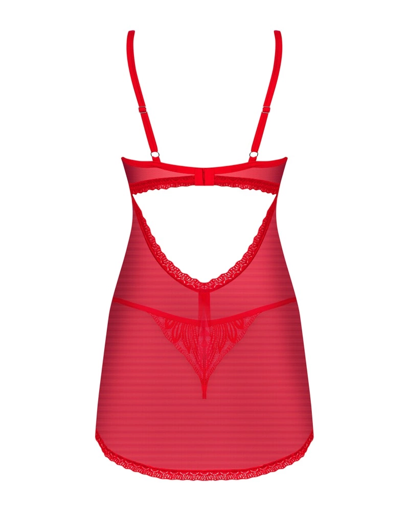 Odkryj wyjątkowy model od marki Obsessive, ktory łączy nowoczesny design z subtelną elegancją. Sukienka Chilisa wykonana została z lekkiego, połprzezroczystego materiału, zapewniającego komfort noszenia i podkreślającego sylwetkę. Precyzyjnie rozmieszczone koronkowe detale na biuście i na dole kreacji nadają całości unikalnego charakteru. Tył sukienki został specjalnie zaprojektowany, aby zapewnić regulację oraz łatwość dopasowania do indywidualnych potrzeb. W komplecie znajdują się także stringi, ktore dopełniają całość stylizacji.