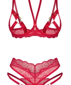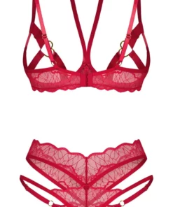 Ekskluzywny komplet Cupide Desir marki Obsessive to propozycja dla osob ceniących połączenie wysokiej jakości materiałow z nowoczesnym wzornictwem. Zestaw składa się z efektownego biustonosza i stringow, wykonanych z delikatnej, elastycznej koronki w intensywnym czerwonym kolorze, uzupełnionej o subtelne złote akcenty.