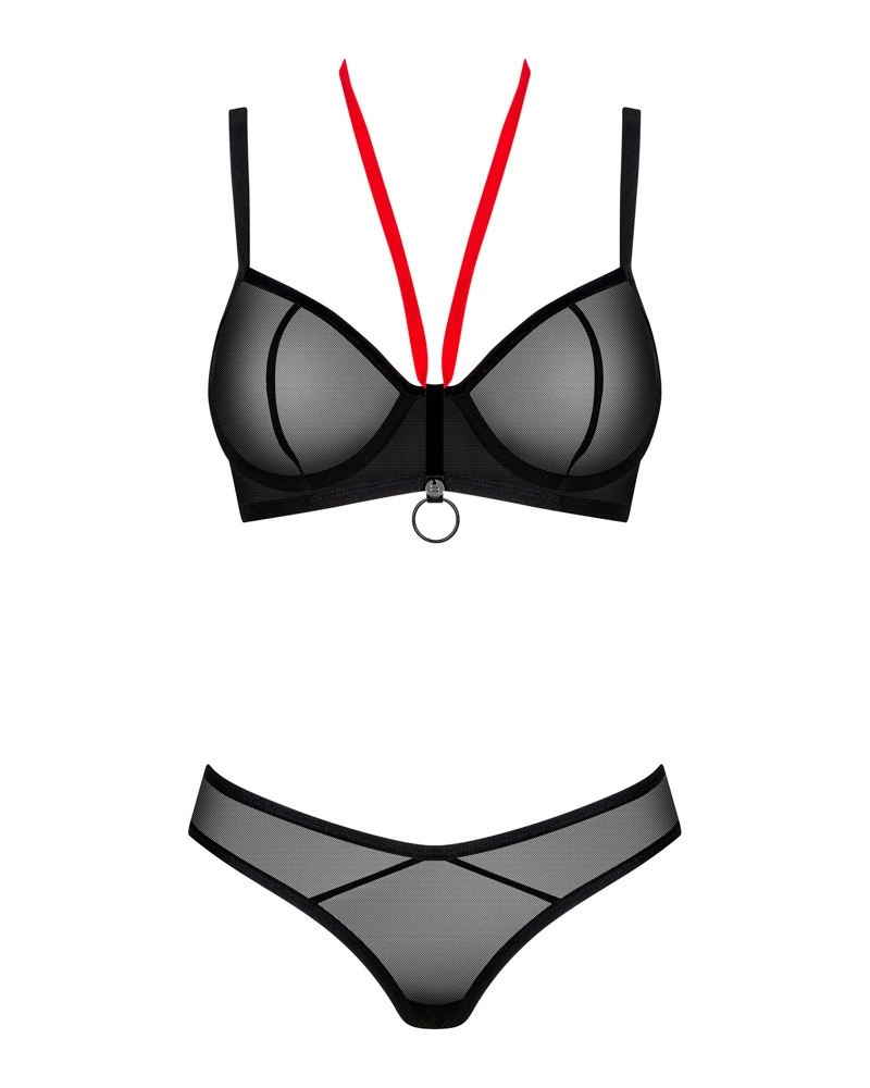 Biustonosz został wyposażony w regulowane ramiączka oraz zapięcie na haftki na plecach, co umożliwia precyzyjne dopasowanie do kształtu ciała. Czerwony pasek w stylu halterneck i ozdobny pierścień z elementem biżuteryjnym pomiędzy miseczkami przyciągają wzrok i dodają elegancji. Miękka, elastyczna siateczka zapewnia wygodę użytkowania przez cały dzień. Stringi z wysokim pasem zostały zaprojektowane z myślą o podkreśleniu bioder oraz komfortowym noszeniu.