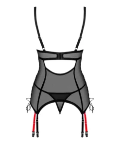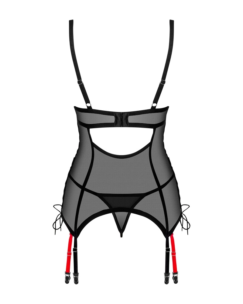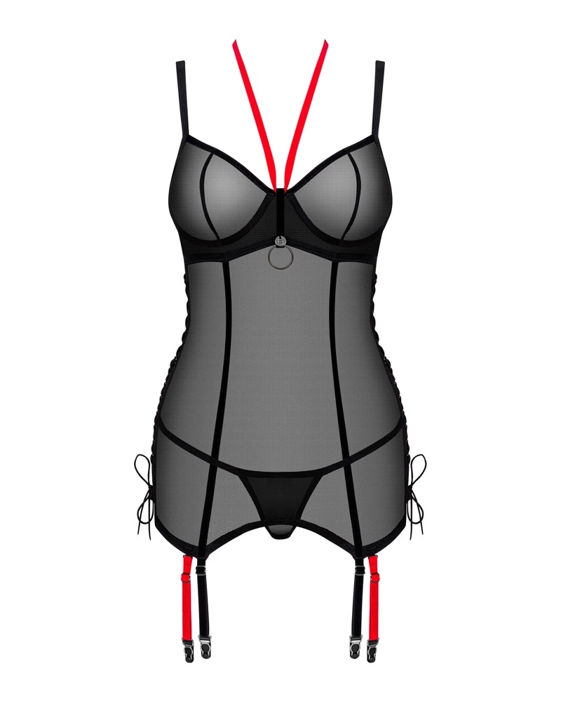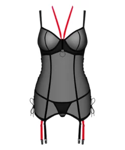 Model Glandez marki Obsessive to elegancki zestaw składający się z czarnej siateczkowej koszulki typu gorsetowego oraz dopasowanych stringow. Całość została wykonana z miękkiego, elastycznego materiału, zapewniającego komfort oraz doskonałe dopasowanie do sylwetki. Gorset wyposażony jest w kontrastujące czerwone detale – halterneck oraz odpinane paski do pończoch, ktore nadają całości unikalnego charakteru.