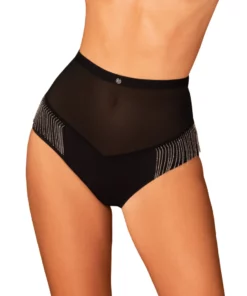 Odkryj elegancką bieliznę stworzoną z myślą o wyjątkowych okazjach. Model Milladis marki Obsessive to wysokie figi, ktore zachwycają nowoczesnym wzornictwem i dopracowanymi detalami. Wyrożniają się zmysłowo prześwitującą siateczką, ktora subtelnie otula sylwetkę, podkreślając jej linię. Boczne wykończenia zostały ozdobione rzędami srebrzystych koralikow, nadając całości efekt biżuteryjny i niepowtarzalny styl. Uwagę przyciąga także elegancka zawieszka umieszczona z przodu, dodająca wyrafinowania.