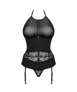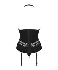 Model został uszyty z elastycznego, miękkiego materiału, ktory doskonale dopasowuje się do sylwetki, zapewniając wygodę podczas użytkowania. Zintegrowane pionowe usztywnienia dbają o odpowiednie ułożenie, a regulowane ramiączka typu halterneck oraz zapięcie na haftki z tyłu umożliwiają indywidualne dopasowanie. Paski do pończoch można także całkowicie odpiąć. W komplecie znajdują się dopasowane stringi, tworząc spojną stylizację.