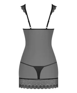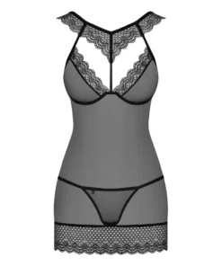 Wyrafinowany komplet marki Obsessive to wyjątkowa propozycja dla osob ceniących styl i komfort. Sukienka o połprzezroczystej strukturze została zaprojektowana z niezwykłą dbałością o detale, podkreślając atuty sylwetki poprzez anatomiczny kroj i delikatne, elastyczne materiały. Elegancka koronka na dekolcie oraz wokoł ud nadaje kreacji lekkości i nowoczesnego charakteru. Model wyposażono w regulowane ramiączka, ktore ułatwiają dopasowanie, oraz w miseczki z fiszbinami, wzmacniające i modelujące gorną część sukienki. Całość dopełnia subtelny pasek na wysokości klatki piersiowej oraz wycięcia zdobiące biust i dolne krawędzie. W komplecie znajdują się rownież dopasowane stringi, tworzące harmonijną całość.