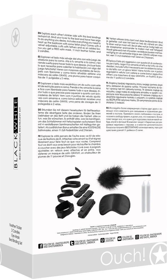 W zestawie znajduje się rownież satynowa maska na oczy, łaskotka z naturalnych pior o długości 28 cm oraz dwie świece przeznaczone do urozmaicenia atmosfery. Całość wykonana została z wysokiej jakości, miękkich materiałow, gwarantujących trwałość i wygodę użytkowania.