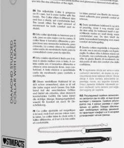 Obroża wykonana jest z wysokogatunkowej skory ekologicznej, ozdobionej efektownymi, błyszczącymi elementami w formie diamentowych ćwiekow. Dzięki możliwości regulacji, obroża oferuje cztery rożne ustawienia, zapewniając komfort użytkowania oraz idealne dopasowanie do obwodu szyi. Gładka powierzchnia wnętrza obroży zapewnia wygodę nawet przy dłuższym noszeniu.
