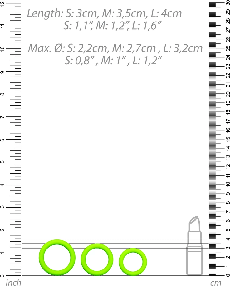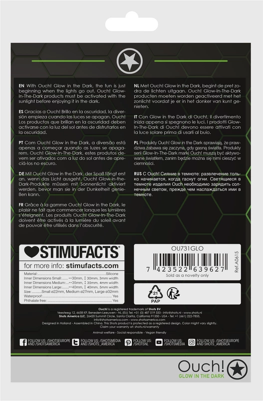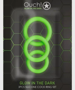 Zestaw pierścieni Ouch! Glow in the Dark to innowacyjna propozycja marki Ouch! dla osob poszukujących funkcjonalnych akcesoriow z nowoczesnym designem. Ten model to komplet trzech anatomicznych pierścieni wyrożniających się fluorescencyjną powierzchnią, ktora po wcześniejszym naświetleniu światłem dziennym lub sztucznym świeci w ciemności. Dzięki temu produkt zyskuje nie tylko praktyczne zastosowanie, ale także unikalny, efektowny wygląd podczas użytkowania w zaciemnionym otoczeniu.
