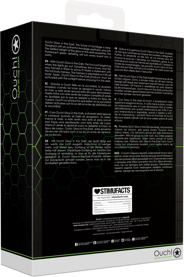 Produkt przeznaczony jest dla osob noszących rozmiar S/M. Aby uzyskać efekt świecenia w ciemności, uprząż należy naświetlić światłem słonecznym lub silnym światłem sztucznym. Idealny wybor dla miłośnikow nietuzinkowych akcesoriow oraz wszystkich, ktorzy chcą wyrożnić się podczas wieczornych spotkań.
