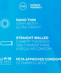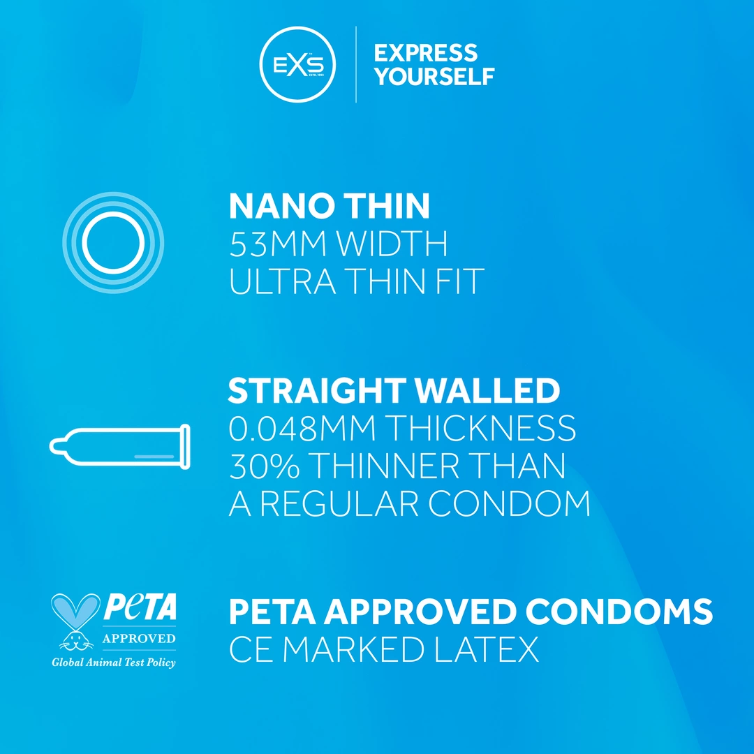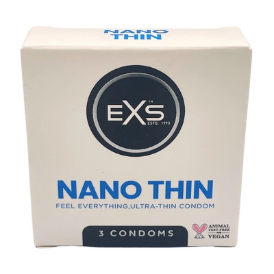 Prezerwatywy EXS Nano Thin mają anatomiczny kształt, ktory zapewnia optymalne dopasowanie i wygodę. Ich nominalna szerokość wynosi 53 mm, a przezroczysta powierzchnia sprawia, że są niemal niewidoczne w użyciu. Każde opakowanie zawiera 3 sztuki zapakowane w indywidualne, higieniczne saszetki.