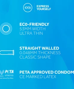 Produkt powstał z myślą o środowisku – EXS Pure to prezerwatywy przyjazne naturze, produkowane z poszanowaniem zasad zrownoważonego rozwoju. W opakowaniu znajduje się aż 48 sztuk, co zapewnia korzystny stosunek jakości do ceny i wygodę na dłużej. Każda prezerwatywa posiada anatomiczny kształt, przezroczystą powierzchnię oraz rezerwuar na końcu.