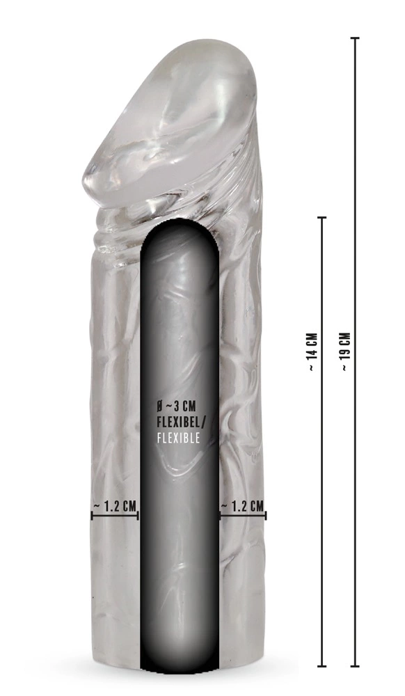 Pokrowiec posiada specjalnie zaprojektowaną, anatomiczną końcowkę oraz strukturę o żylastej teksturze, ktora nie tylko zwiększa długość o ok. 5 cm, ale także optycznie dodaje objętości. Całkowita długość modelu to ok. 19 cm, dzięki czemu idealnie nadaje się do wielu zastosowań. Konstrukcja została przemyślana w taki sposob, aby zapewnić łatwość zakładania i zdejmowania oraz pewność użytkowania.