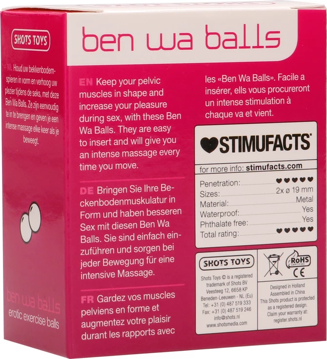 Każda z kul została wykonana z bezpiecznego materiału, ktory jest przyjazny dla ciała i łatwy do utrzymania w czystości. Zestaw składa się z dwoch kul, ktore można stosować indywidualnie lub razem, w zależności od poziomu zaawansowania. Ergonomiczny kształt oraz wygodne wykończenie zapewniają komfort podczas użytkowania, a przemyślany system łączenia ułatwia aplikację i wyjmowanie produktu.
