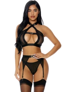 Poznaj wyjątkowy zestaw bielizny marki Golden Hous Forplay w rozmiarze L – propozycję, ktora łączy nowoczesny design z komfortem noszenia. Zestaw składa się z trzech starannie zaprojektowanych elementow: biustonosza z satynową gumką i eleganckim grawerowanym złotym okuciem, wyciętego pasa do pończoch oraz stylowych majtek. Przeźroczysta, siateczkowa tkanina nadaje kompletowi lekkości i zapewnia przewiewność, a kontrastowe detale podkreślają charakter modelu.