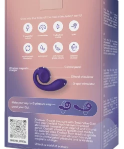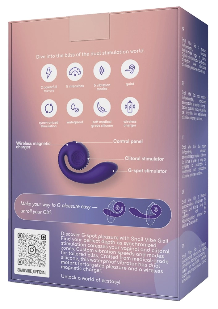 Wyposażony w dwa niezależne, ciche silniki, Snail Vibe Gizi oferuje aż 25 kombinacji trybow pracy, dzięki pięciu stopniom intensywności dla każdego z silnikow. Intuicyjne sterowanie przyciskami pozwala łatwo dopasować funkcje do własnych preferencji. Powierzchnia urządzenia została wykonana z wysokiej jakości, jedwabiście miękkiego silikonu, ktory jest przyjazny dla skory, łatwy w czyszczeniu i niezwykle trwały. Całość jest wodoodporna, dzięki czemu można korzystać z urządzenia także pod prysznicem lub w wannie.