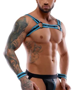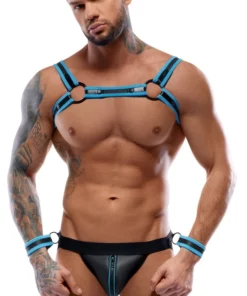 - Komplet: uprząż na ramiona, jock (slipy bez tyłu), dwa mankiety