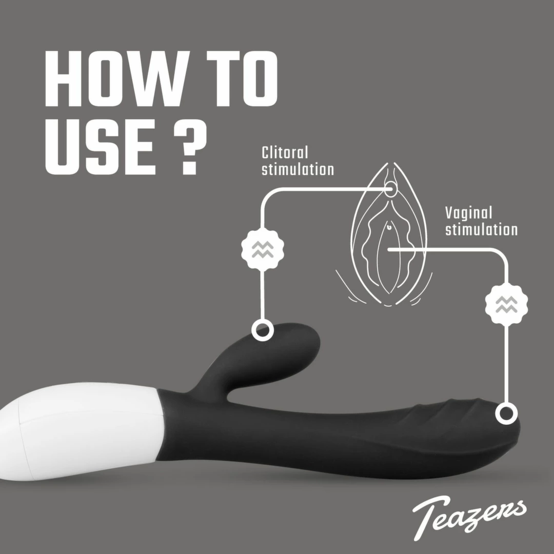 Teazers Rabbit Vibrator Black to nowoczesny, dwufunkcyjny model wykonany z wysokiej jakości silikonu, ktory łączy w sobie ergonomiczny kształt z zaawansowaną technologią. Urządzenie zostało zaprojektowane z myślą o komforcie użytkowania oraz wszechstronności – wyposażone w 30 zrożnicowanych trybow pracy, pozwala na indywidualny dobor ustawień.