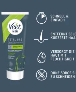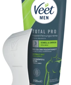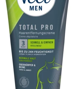 Odkryj skuteczną pielęgnację i wygodę – Veet Men Total Pro to zaawansowany krem do depilacji, ktory umożliwia szybkie i dokładne usunięcie niepożądanych włosow z gornych partii ciała oraz nog. Specjalnie opracowana formuła została dermatologicznie przetestowana, zapewniając bezpieczne działanie bez podrażnień.