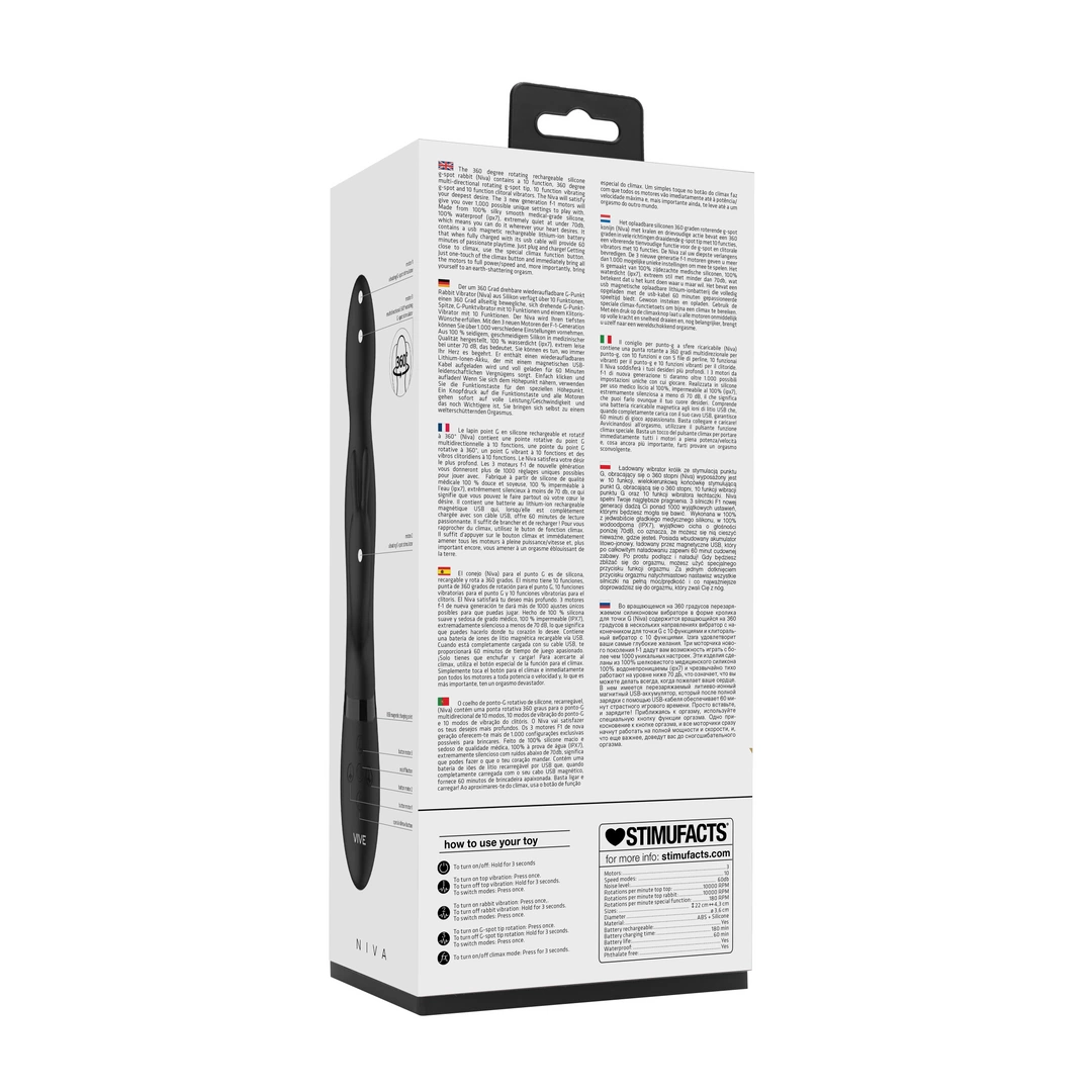 Urządzenie zostało wykonane w całości z jedwabiście gładkiego silikonu klasy medycznej, co gwarantuje bezpieczeństwo oraz komfort. Końcowka modelu Niva obraca się w zakresie 360°, umożliwiając precyzyjną stymulację. Produkt oferuje 10 trybow pracy końcowki anatomicznej oraz 10 dodatkowych ustawień wibracji zewnętrznej, co pozwala na pełną indywidualizację działania.