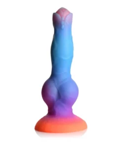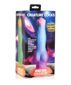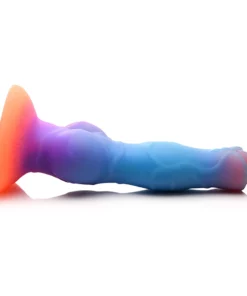 XR Brands Creature Cocks silikonowy model świecący w ciemności to innowacyjny produkt zaprojektowany z myślą o fanach kreatywnych akcesoriow i kolekcjonerach unikalnych przedmiotow. Wyrożnia się efektownym, kosmicznym wzornictwem oraz zastosowaniem wysokiej jakości silikonu, ktory zapewnia trwałość i łatwość utrzymania w czystości. Model ten został wzbogacony o intensywne, psychodeliczne kolory przechodzące od czerwono-pomarańczowej podstawy do fioletu i błękitu, co nadaje mu wyjątkowy, futurystyczny charakter. Dodatkowo powierzchnię pokryto brokatem, ktory po naświetleniu światłem słonecznym lub UV świeci w ciemności, potęgując efekt wizualny.