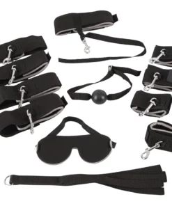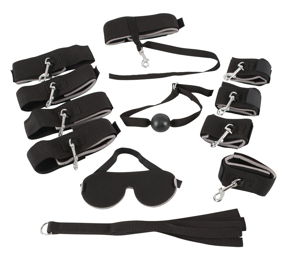 W zestawie znajdują się cztery wyściełane mankiety na ramiona (długość 39 cm, szerokość 6 cm), cztery wyściełane mankiety na nogi (długość 56 cm, szerokość 6 cm), jeden mankiet na szyję (wysokość 5,5 cm), regulowany knebel na usta (średnica 4,1 cm), bicz o długości 38 cm oraz maska na oczy z elastycznym paskiem. Wszystkie akcesoria mocowane są do tablicy za pomocą karabińczykow, co pozwala na szybkie i bezpieczne użytkowanie oraz indywidualne dopasowanie.