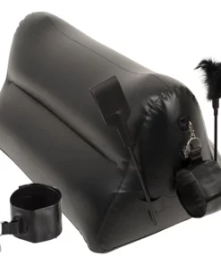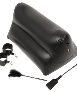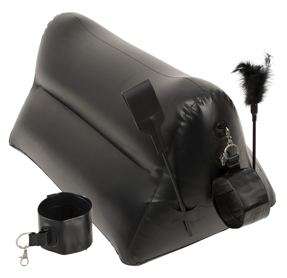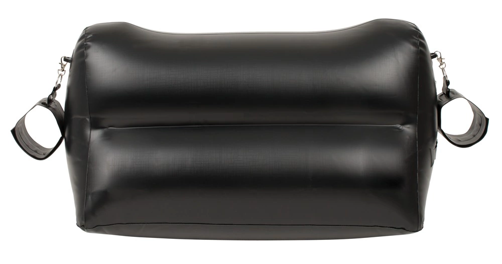 Poduszka jest łatwa do nadmuchania, dzięki czemu idealnie sprawdzi się zarowno w domu, jak i podczas podroży. Jej specjalnie wyprofilowany kształt wspiera ciało, pozwalając na wygodne dostosowanie pozycji. Dodatkowo, każda strona wyposażona została w solidne uchwyty, umożliwiające przypięcie dołączonych akcesoriow – praktycznych kajdanek z karabińczykiem, ktore można łatwo zamocować lub odpiąć według potrzeb.