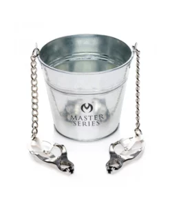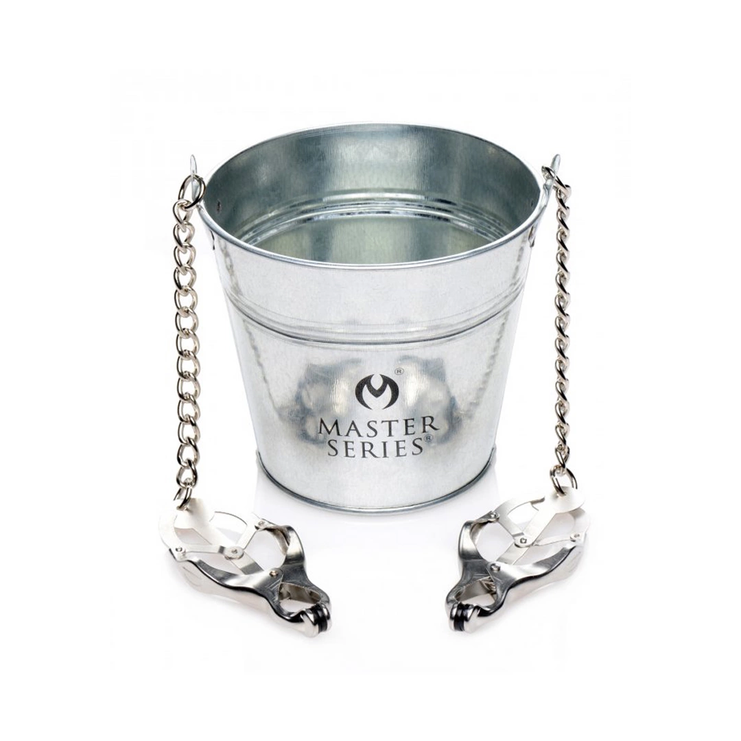 Całość została wykonana z wysokiej jakości stali nierdzewnej, zapewniając trwałość oraz bezpieczeństwo użytkowania. Zaciski zostały wyposażone w system mocowania na łańcuszku, dzięki czemu siła docisku może być regulowana poprzez zwiększanie lub zmniejszanie obciążenia w pojemniku. Produkt doskonale sprawdzi się jako element urozmaicenia kolekcji akcesoriow do praktyk intymnych, pozwalając precyzyjnie dostosować intensywność działania.