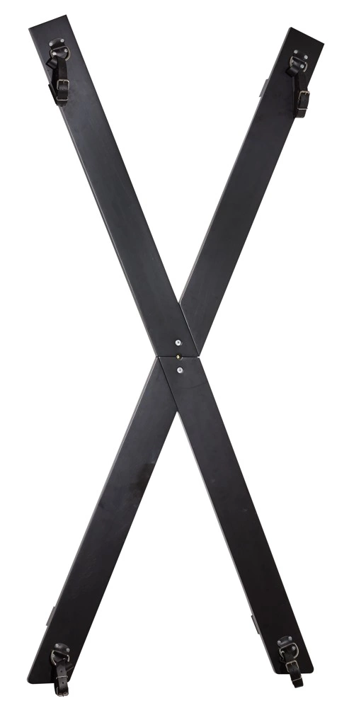 Krzyż św. Andrzeja został wykonany z solidnej sklejki drewnianej, a elementy metalowe zapewniają stabilność montażu. Do zestawu dołączono cztery wytrzymałe, regulowane pasy wykonane ze skory oraz metalowe pierścienie umieszczone na końcach ramion, ktore umożliwiają szybkie i wygodne mocowanie. Całość prezentuje się nowocześnie oraz pasuje do rożnych aranżacji wnętrz.