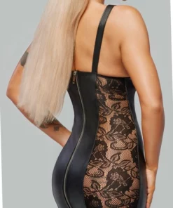 ZADO Sukienka skorzana na szelkach z koronką czarna L – połączenie elegancji i nowoczesnego designu!